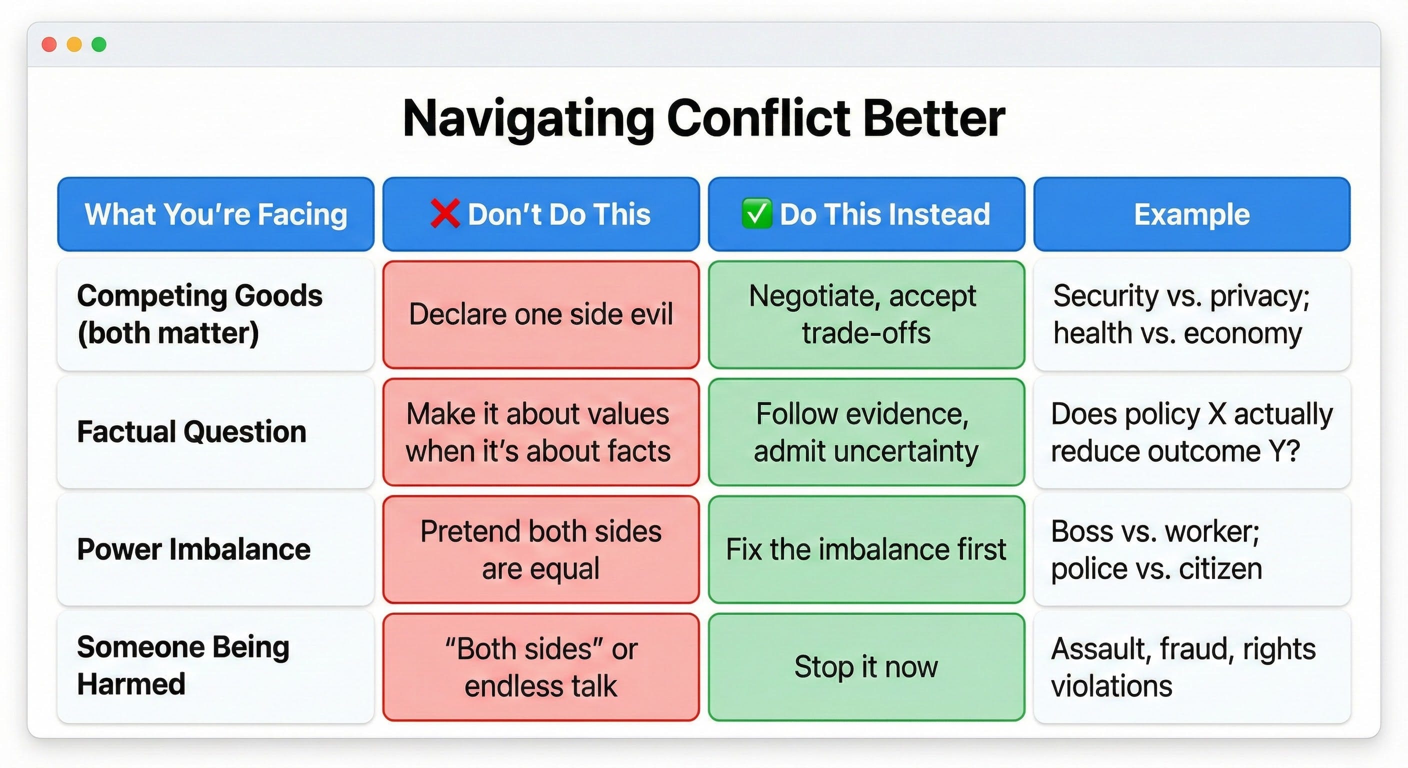 Third: Figure out what kind of fight this is. Is it competing goods that both matter? A factual question evidence can help settle? A power imbalance that needs fixing first? Or actual harm being done right now? Different kinds of conflicts need completely different responses.